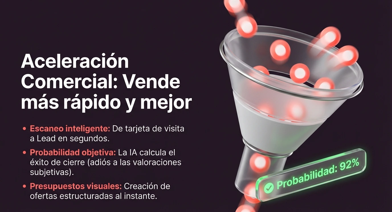 | CRM / Ventas | Lead scoring y pipeline estándar | Escaneo de tarjetas, probabilidad de cierre inteligente, automatización comercial |