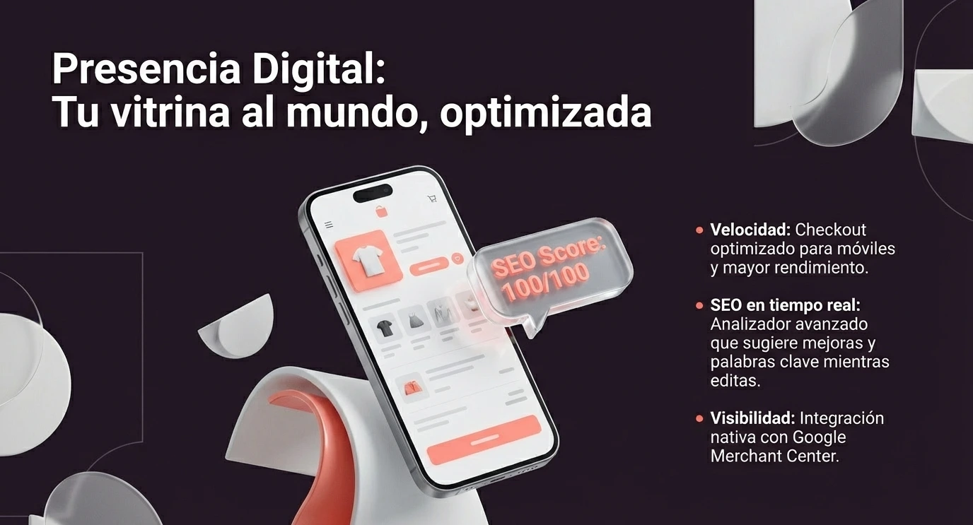 El área SEO recibe un analizador avanzado que evalúa la página en tiempo real, sugiere mejoras y permite trabajar palabras clave directamente desde el builder. Además, la integración con Google Merchant Center otorga más visibilidad a productos y catálogos.