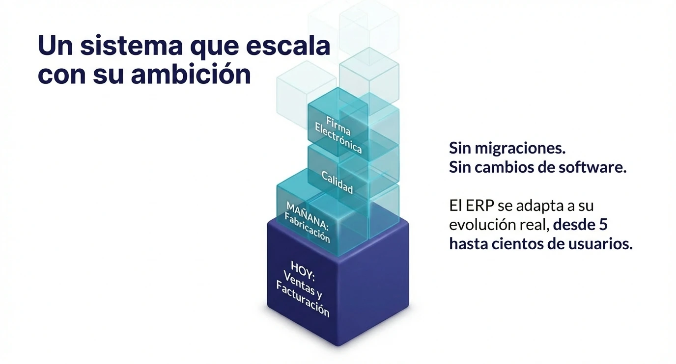 Una empresa que arranca con ventas y facturación puede, con el tiempo, incorporar inventario avanzado, fabricación, control de calidad, gestión documental, proyectos, servicios, firma electrónica, marketing automation o un portal de clientes, siempre sobre la misma base. Esto convierte a Odoo Enterprise en un sistema que se adapta a la evolución real de la empresa: no obliga a migrar a nuevos software a medida que aparecen nuevas necesidades.