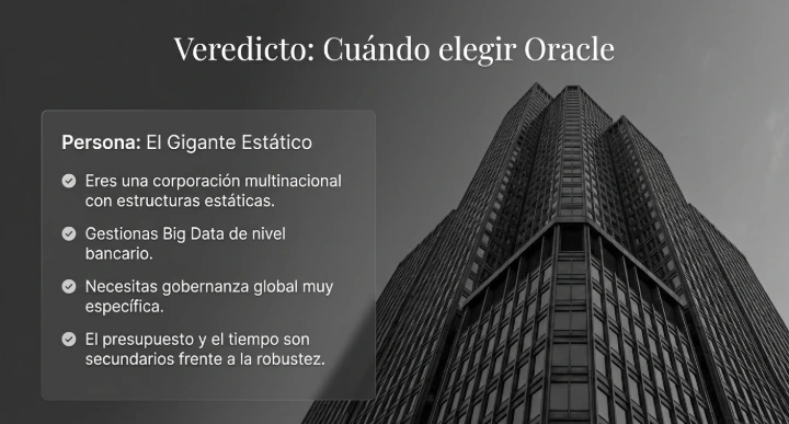 Oracle es sinónimo de potencia bruta. Está diseñado bajo una premisa de control absoluto y jerarquía. Es la herramienta predilecta de organizaciones donde los procesos son rígidos, inmutables y requieren una auditoría constante a escala global.