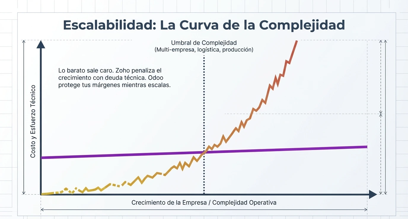 Para empresas con procesos simples o sin necesidad de un ERP real, Zoho es suficiente. Para compañías que necesitan unir inventario, contabilidad, operaciones y ventas, el límite aparece rápido.